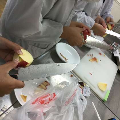 はじめは、りんごの皮むきです。包丁を使って4分の1に切ったりんごの皮をむきます。緊張しながら挑戦していました。自分で皮をむいたりんごの味は、格別だったようです。