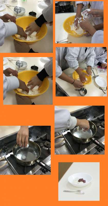 つぎは、白玉だんご作りです。粉に水を加え練ってだんごを作ります。水の分量の微妙な加減がむずかしく、ゆるくなってこまった班もあったようです。