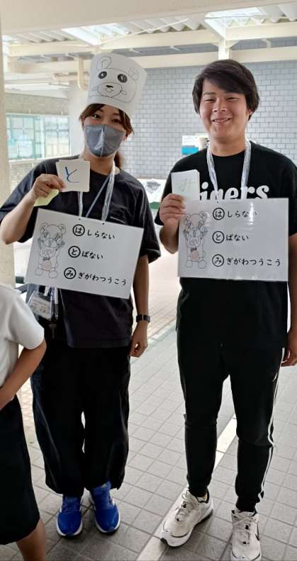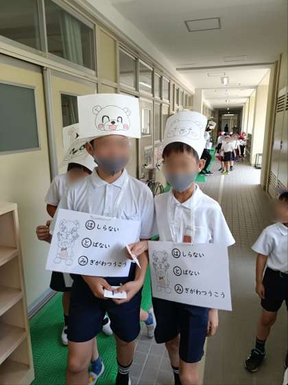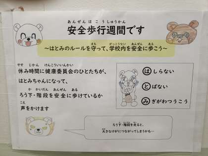 あの手この手で、校内の事故やケガを少しでも減らそうと、健康委員会の子どもたちが中心になって活動しています。もちろん、子どもだけでなく、先生たちも身体をはっています!