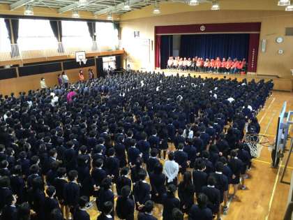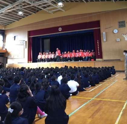 オレンジ隊の皆様は、朝の見守りに引き続き来校され、子ども達の拍手に笑顔で手を振り答えながら講堂に入場されました。
