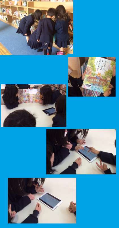 タブレットは8台。班に一台配られています。各タブレットには、図書室にある絵本の名前とその本に関する問題が4問入っています。図書委員会で児童と先生が作成しました。
