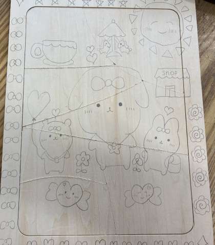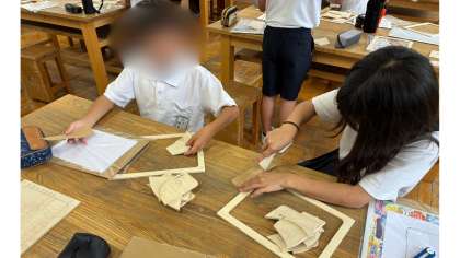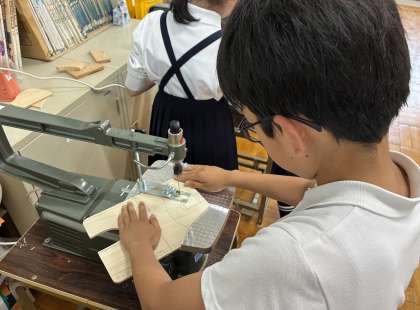 5年生は図画工作科で、パズルを作っています。糸のこぎりで木を切ります。集中していますね。切った後はやすりで整えます。最後は色を付けて完成です。完成が楽しみですね。