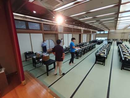食事の10分前です。教職員によるアレルギーの対応のチェックや 靴の置き場所、子どもたちのご飯のおかわりの炊飯器の場所など確認しています。