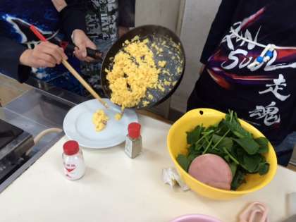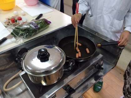 フライパンを使ってスクランブルエッグを作ったり、ウインナーを炒めたりしています。グループによっては、卵焼きにしているところもありました。