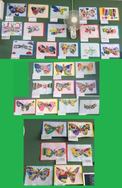 この蝶は、カラー紙版画で作った作品です。色の付いた紙を切ったりちぎったりして台紙に貼り付け、蝶の形にします。水で湿らせた白い和紙をかぶせ、新聞紙を置いてこすると色が白い紙に写りカラー版画のできあがりです。美しく、不思議な蝶がいっぱいですね!