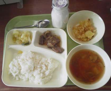 3月15日(火)の給食は、卒業お祝い献立でした。メニューは、サーロインのペッパー風味、トマトスープ、キャベツときゅうりのピクルス、りんごのクランブル、米飯、牛乳でした。いつもより豪華なメニューです。どれもおいしく感じましたが、6年生の教室では、サーロインのペッパー風味が大人気だったようです。今日は、卒業式の予行もあり、6年生と5年生はがんばった分、おいしさも増したのではないでしょうか。
