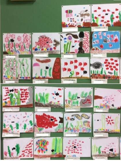 ↓ 下の作品は「スイミーの絵」です。1年生は国語の授業で「スイミー」を学習しました。そして、物語の世界を絵に表現したのです。いろいろな場面を選んで描いています。国語で学習した物語をこのように絵で表現することで、自分にしか表せないスイミーの世界が出来上がりました。とっても素敵ですね!