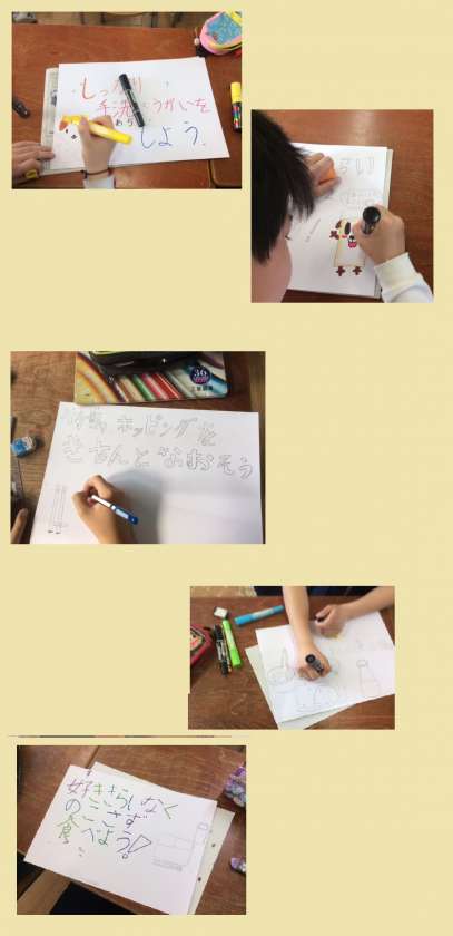 下は、全校に呼びかけようとそれぞれの願いを込めポスターを作成しているところです。給食委員会 健康委員会 運動委員会 です。どのポスターがどの委員会かわかりますか?