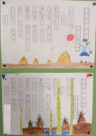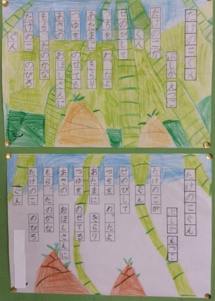 2年生は、1学期の国語の学習の最初に、この「たけのこ ぐん」という ぶしか えつこ さんの詩を学びました。何度も音読しながら、たけのこが、ぐん と せのびして土を割って伸びる様子を動作でも表現したそうです。