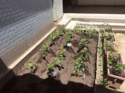 5月13日なかよし学級では、枝豆の苗を植えました。植える前に苗の背の高さを測りました。植えたのはなかよし教室の近くにある中庭の小さな学習園です。あまり日当たりはよくありませんが、例年、立派に実が実り、収穫することができています。成長の様子を継続して観察し学習を進める予定です。