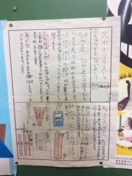 階段の掲示板でこんな新聞をみつけました。スポーツテストをがんばろうという気持ちが伝わってきますね。すばらしい応援メッセージだと思います。
