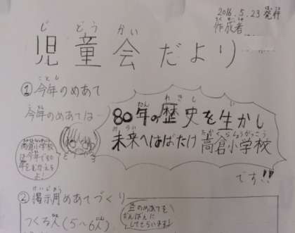 「80年の歴史を生かし、未来にはばたけ高倉小学校」です。子どもたちの頑張ろうという意欲が伝わってきますね!