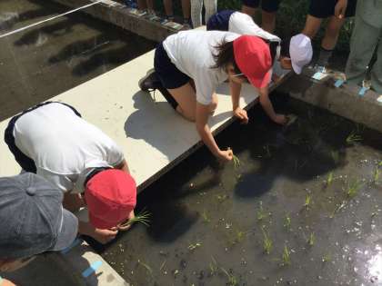 肝心の田植えは、管理作業員さんに手伝っていただきながら一本一本丁寧に、均等になるように植えていきました。