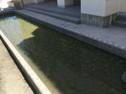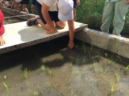 水の張った水田はこれまでのごつごつした感じとは違い、子どもたちもその様子に、その見ずに、おどろいていました。