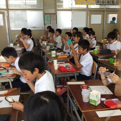 実際に歯を磨いて、口の中の汚れがきれいにとれているかをテスターを使って確かめました。奥歯に磨き残しが見つかった子が多かったようです。