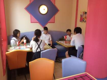 今日のお昼は行動班でレストランを選びミールクーポンを使って食べます。入村後、まず昼食を食べている班をみつけました。時間が早めで空いているのですぐ食べることができました。これも作戦ですね。