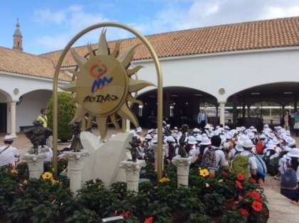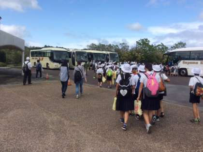 予定通り出発しました。お土産を大切そうに持っている子がいますね。いつの間にか美しい青空になりました。