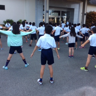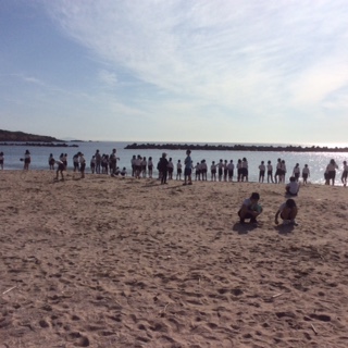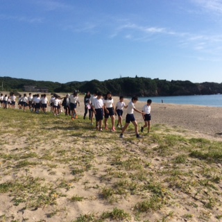 朝の会、ラジオ体操の後.海岸を散歩しました爽やかです。全員元気です。