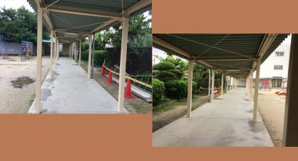 6月15日より始まった管理作業員の作業が本日終了しました。この作業は、営繕班の方と本校管理作業員による合同作業で、講堂の渡り廊下の塗装をメインにしたものです。そのほか、夏休み用のプール更衣室やプールトイレにも取り掛かり、本日で営繕班の作業日は終わりましたが、続きは、本校の管理作業員が仕上げます。