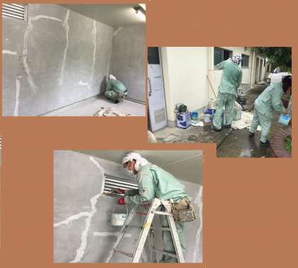 美しくなった渡り廊下とプール更衣室の作業の様子、完成したプール更衣室左の美しい壁をご紹介しましょう。