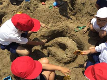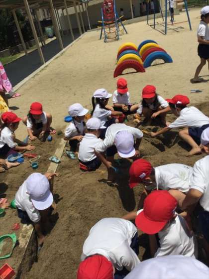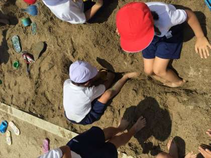 砂場で水をつかって、子どもたちは山をつくったり、穴を掘ったりして泥んこになりながらも楽しそうに活動していました。