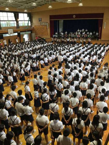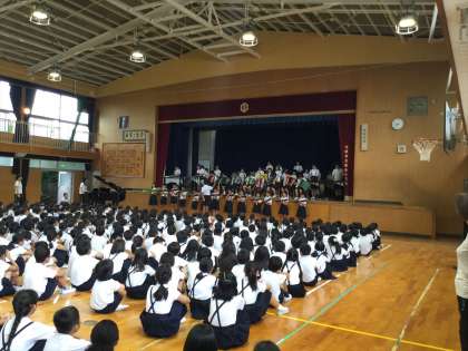 次に「校歌」の演奏。演奏に合わせて全校児童が歌いました。