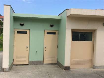 プール更衣室入口付近の扉と外壁・内壁、トイレ内壁、北門扉が明るく、きれいに生まれ変わりました。
