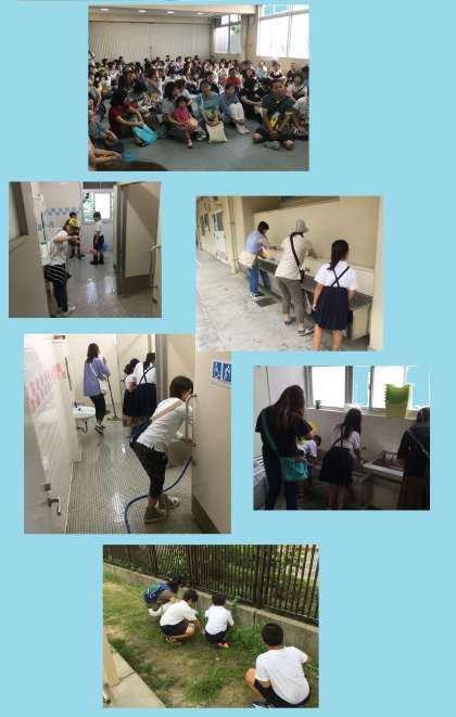 9時に多目的室には、122名の保護者が集合。その後、校内の教室やトイレ、手洗い場、階段、廊下などで清掃する児童に合流し、清掃の仕方を実演を通して教えていただき、子どもたちと共に校内清掃に汗を流していただきました。子どもたちも、保護者の皆様に清掃の仕方の見本を見せていただくことで、普段よりも一生懸命、清掃活動に取り組むことができました。なかなかできない部分の清掃もしていただき、おかげさまで、校内はピカピカに美しくなりました。
