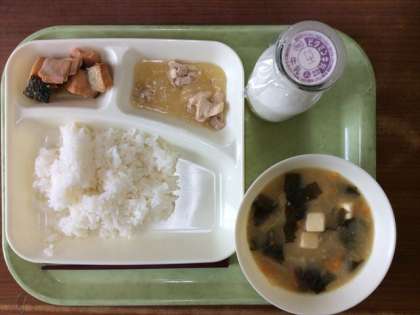 献立は、さけのつけ焼き、みそ汁、とうがんの煮物、ごはん、牛乳でした。