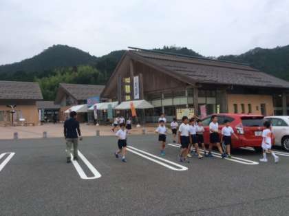 ミストのような小雨で暑くなく、全員元気です。車中では配られた飴を味わいながら、緑一杯の車窓の景色を楽しんでいます。