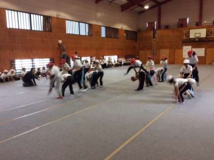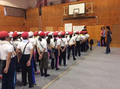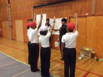 雨のため登山は明日に延期し体育館でクラス対抗大運動会をすることになりました。選手宣誓の次は、馬跳び競争です。この競技の1位は3組です!どの組もがんばれ、まけるな!!