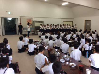 宿舎での最後の食事は、炊きこみご飯でした。3日間お世話をしてくれた食事係全員と元気な声で「ごちそう様でした。」