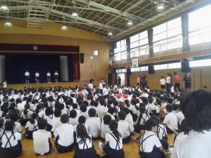 久しぶりの児童集会です。子どもたちは、キッズファミリー班の班長を中心に講堂に整列し、集会委員会の5年生、6年生の出題を食い入るように聞いています。ヒントを聞いてキャラクターの名前を答えるクイズです。