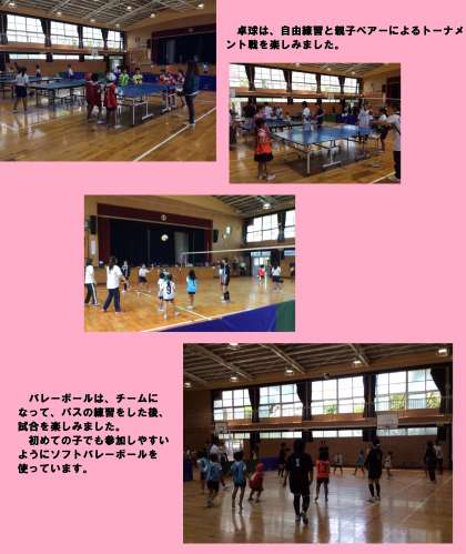 講堂での開会式の後、卓球、バレーボール、キックベースボール、ソフトボールに分かれて和やかにそれぞれの運動を楽しみました。