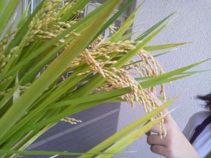 稲穂は頭を下げ、もみを触ると実がしっかり入っているのが手ごたえでわかります。