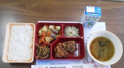 米飯とみそ汁はあたたかく提供されています。おかずは、安全のため保冷されたものが提供されていますが、冷めてもおいしいように工夫されていると感じました。実際、竜田揚げは少し硬く感じましたが、どのおかずもおいしかったですよ!