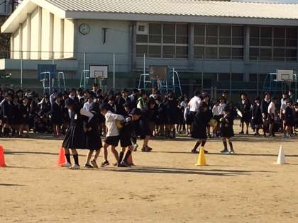本日(11月9日)の朝、児童集会が行われました。内容は、縦割り班で「ボールはさみリレー」をしました。