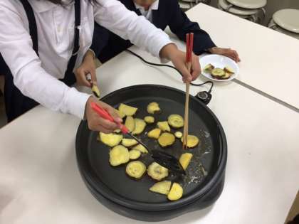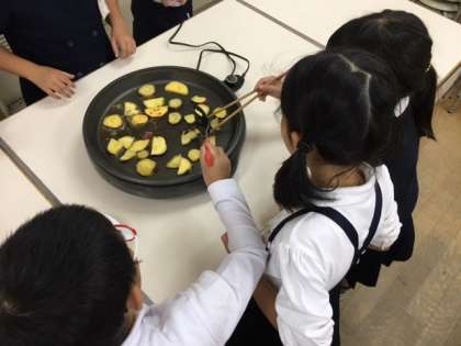 みんなで力を合わせて収穫した「さつまいも」を調理しました。子どもたちは輪切りにしたさつまいもをホットプレートの上にならべて、マーガリンで香ばしく焼き上げました。家庭科室の中が香ばしいにおいに包まれ、音を立てておいしそうに焼き上がるおいもを見ながら子どもたちは歓声をあげていました。