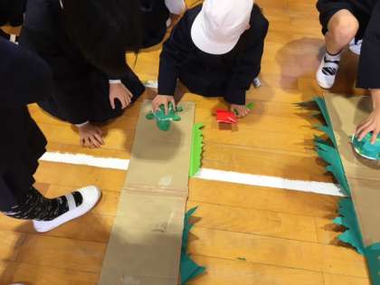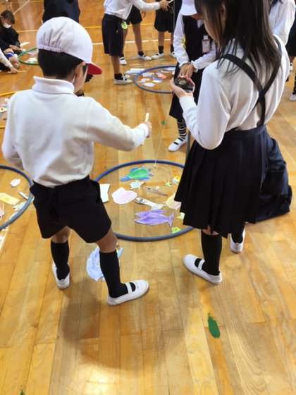 招待した1年生の子どもたちを喜ばせるために、2年生の子どもたちは優しく接しながら、遊び方を教えてあげたり、積極的に遊びの輪の中に誘ってあげたりしていました。
