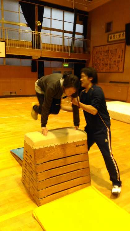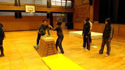 都合が悪くで参加できない教員以外は参加し、跳び箱の指導方法について、特に補助の仕方について学びました。