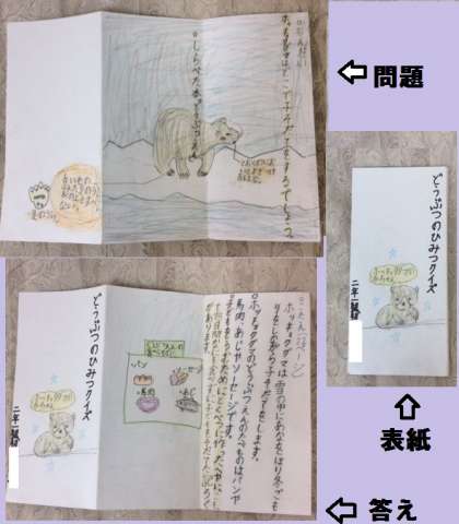 2年生は、国語「ビーバーの大工事」の学習を基に、自分の調べてみたい動物や昆虫などの図鑑を読み、動物のひみつクイズを考え、リーフレットにしました。1組の作品から紹介します。