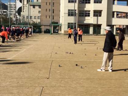 実際にやり始めてみると、これがけっこう楽しくて、子どもたちはわいわいと歓声をあげながら金属の球を目標めがけて転がしていました。ペタンクを通して、老人クラブの方々と5年生の子どもたちがお互いに顔見知りとなり、楽しいひと時を過ごしました。世代間交流がより深いものになりました。