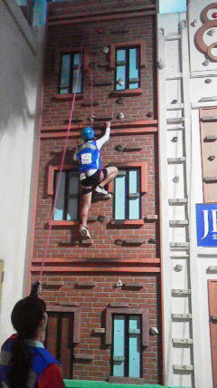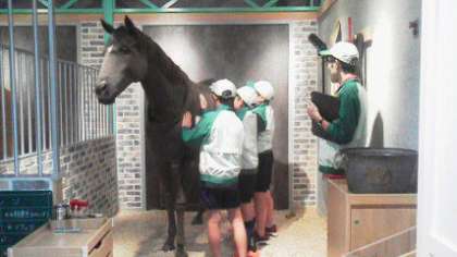 (左から)厩舎で馬にブラシをかけ、馬が気持ちよさそうに目をほそめしっぽを動かしていました。ソフトクリーム屋さんやクライミング体験にもチャレンジしました。