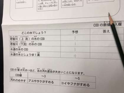 水質検査では、4種類の水(川の上流の水・川の下流の水・水道の水・水道の水に醤油を一滴入れた水)から汚れがひどい順番を予想して、それぞれの水をパックテスト(COD)を使って水質検査をしました。パックテストで変化した水の色を観察して魚が棲むことのできる水質かどうか予想したことをふまえて考えました。