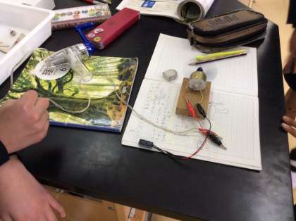 6年生の理科の学習では、手回し発電機で発電した電気をコンデンサーに蓄え、利用する学習に取り組んでいました。