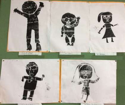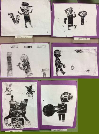 2年生は、図画工作で、運動などをして動いている人を紙版画で表現しました。始めに画用紙で人の体を作り、大きさや太さ、組み合わせ方など動いている様子をどうすれば表現できるかいろいろと試してみました。そしてそれを紙版画にしました。インクを塗ったり、紙に写し取ったりと難しいこともたくさんありましたが、とっても素敵な作品ができあがりました!