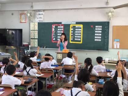 子どもたちは、姿勢正しくきちんと挙手をして元気よく授業に取り組んでいました。