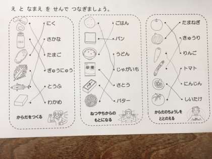 学習のまとめとして、からだをつくる食品(赤)、ねつやちからのもとになる(黄)、からだのちょうしをととのえる(緑)と食品のグループ分けも行い、自分たちが食べる食品の栄養について関心をもちました。