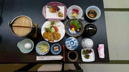 夕食は、お刺身やトンカツなどが並んでいて、とっても豪華です。