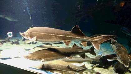 上の写真は、チョウザメです。このサメの卵がキャビアだと知っている子もいました。